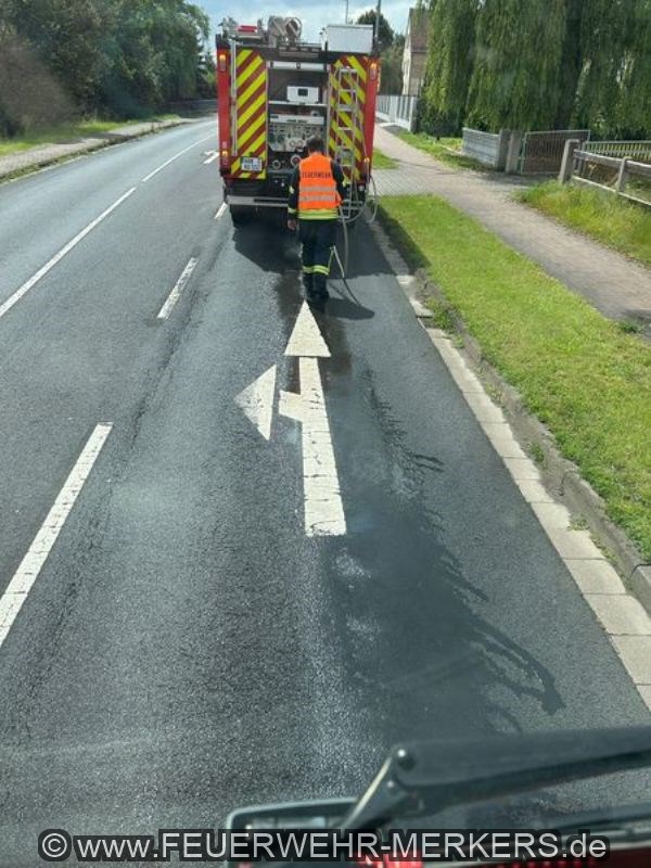 Nachmittag wurden wir erneut zu einer Ölspur alarmiert. Diesmal ging es auf die B84 nach Kieselbach. Aufgrund eines technischen Defekts verlor ein Traktor Öl. Die Spur verlief von Tiefenort bis Kieselbach. |